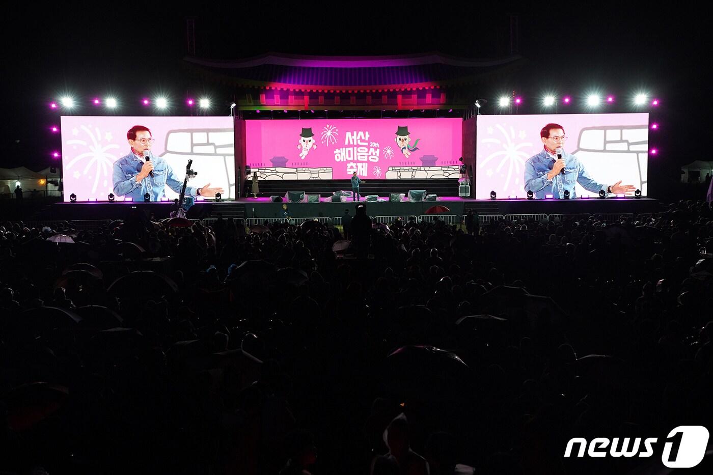 지난 8일 야간공연에 앞서 관람객들을 대상으로 환영의 인사를 전하는 이완섭 서산시장.(서산시 제공)/뉴스1
