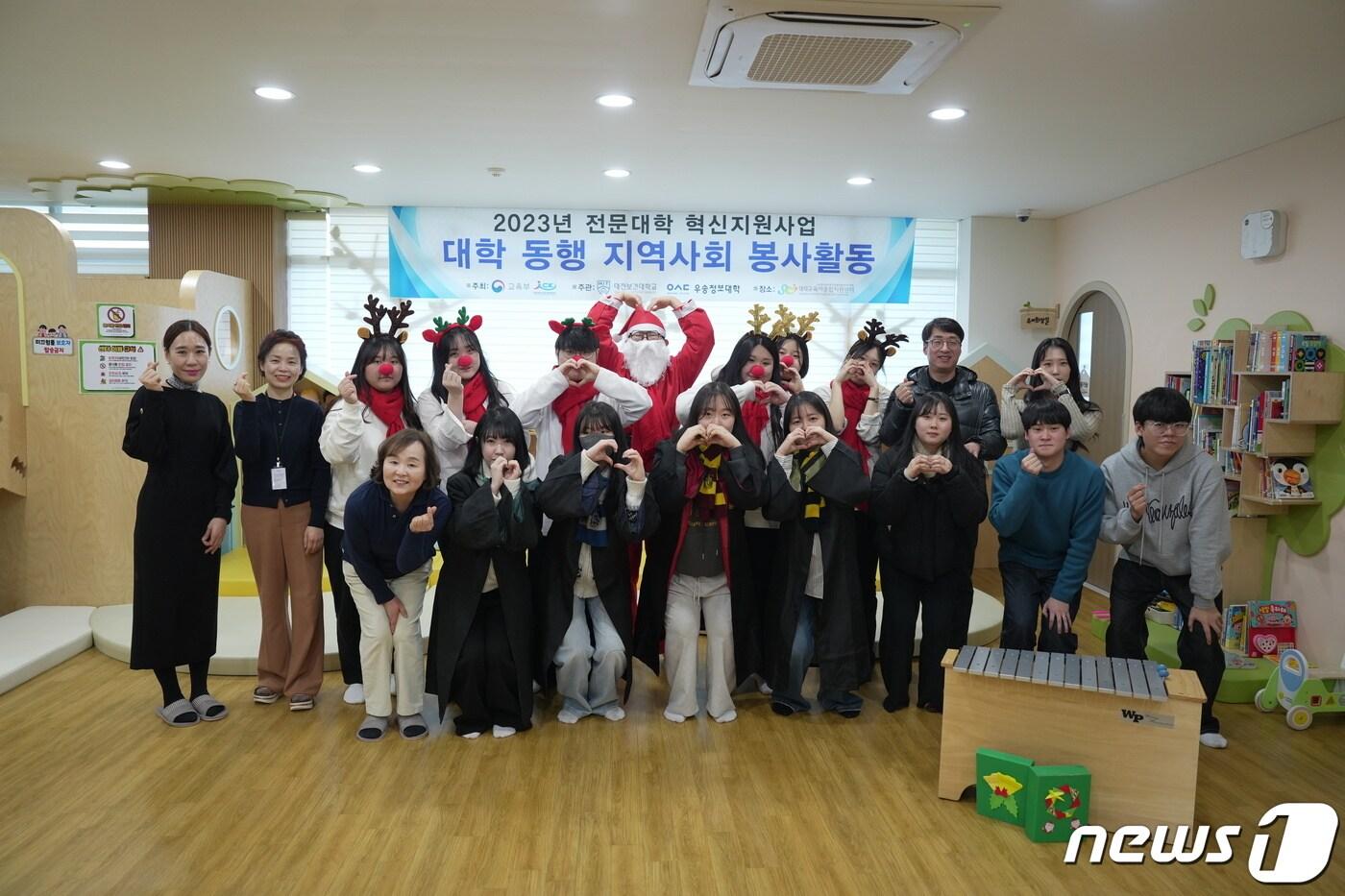 지난 8일 대전 대덕구육아종합지원센터에서 진행된 ‘대학 동행 지역사회 봉사활동’에 참가한 대전보건대와 우송정보대 학생들이 기념사진을 찍고 있다. (대전보건대 제공)/뉴스1