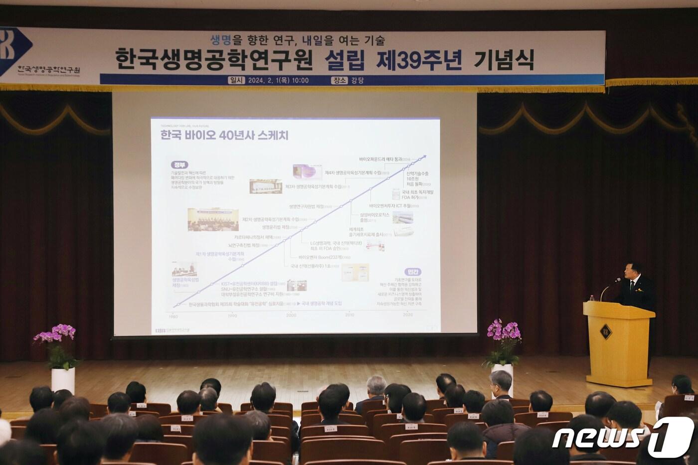 김장성 한국생명공학연구원장이 1일 설립 제39주년 기념식에서 발전방향을 발표하고 있다.(생명연 제공)/뉴스1