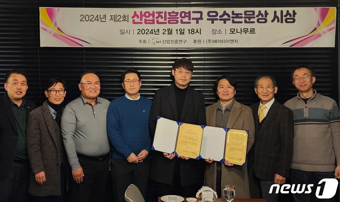 1일 열린 제2회 산업진흥연구 우수논문상 시상식에서 수상자와 참석자들이 기념촬영을 하고 있다. 왼쪽부터 임상호 순천향대 교수, 강현규 순천향대 객원교수(㈜에이티이엔지 대표), 유성용 순천향대 교수, 이창식 한서대 교수, 이자현 순천향대 교수, 박병기 호서대 교수, 박상흡 공주대 명예 교수, 고경한 열린사이버대 특임교수.(산업진흥 연구 제공)/뉴스1