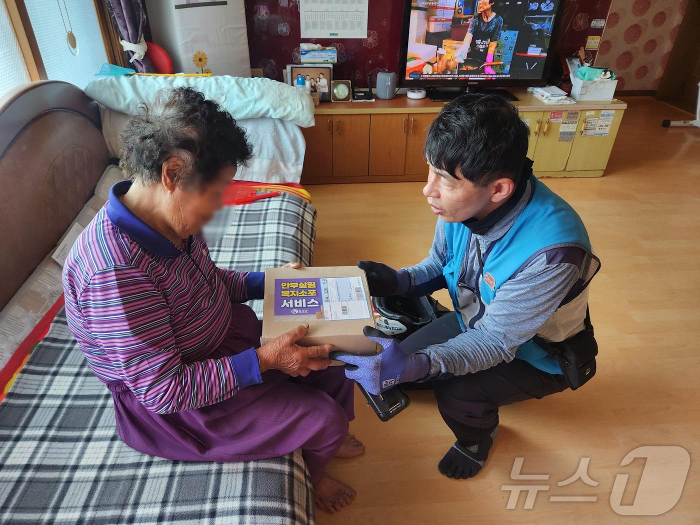 홍성군의 한 집배원이 노인가정을 방문해 생활용품이 들어 있는 ‘안부살핌 복지소포’ 을 전달하고 있다. (홍성군 제공) /뉴스1