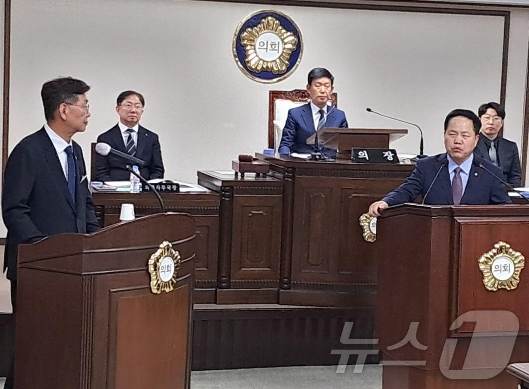 올 1회 추경안 심의서 '불요불급' 이유 삭감주민자치·마을공동체 관련 예산도 깎여지난 14일 대전 중구의회 본회의장에서 윤양수 의장(오른쪽)이 김제선 구청장에게 구정 질문을 하고 있다. 2024.6.14. /뉴스1 ⓒNews1 최일 기자