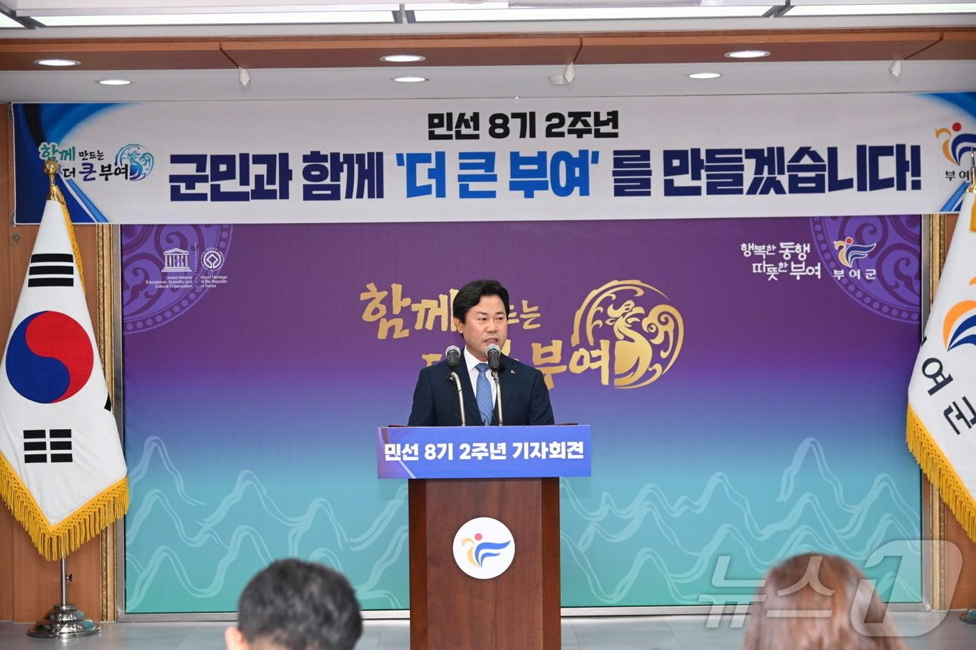 박정현 부여군수가 2일 군청 브리핑실에서 열린 민선8기 2주년 기자 간담회에서 발언하고 있다. (부여군 제공) / 뉴스1