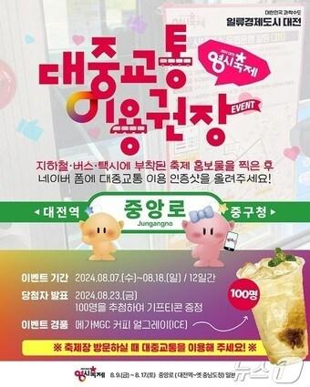 대전0시축제 대중교통 이용권장 SNS 이벤트 홍보물.(대전시 제공)/뉴스1관련 키워드대전시0시축제대중교통지하철버스택시기프티콘관련 기사대전시의회 산업건설위원회, '0시 축제' 교통종합상황실 현황 점검대전시, 대전~오송 B1 노선 증편 운행…버스 5대 추가 투입대전0시축제에 자율방재단 120여명 교통 안내 봉사활동노잼서 꿀잼으로…대전 '꿈돌이' 마케팅으로 일류 관광도시 만든다'대전 0시 축제', 성공 개최 위한 맞춤형 교통 통제 돌입