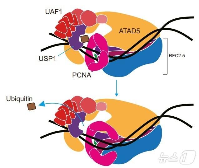 ATAD5 단백질이 DNA에 결합한 Ub-PCNA의 탈유비퀴틴화를 촉진. (기초연 제공)/뉴스1강석현 IBS 연구위원. /뉴스1관련 키워드기초과학연구원IBSDNA 복제DNA 손상 복구염색체 복제관련 기사UNIST·IBS, 세포 분열 직전 DNA 연결고리 자르는 효소 규명DNA 복제 재개 조절하는 '스위치 단백질' 찾아