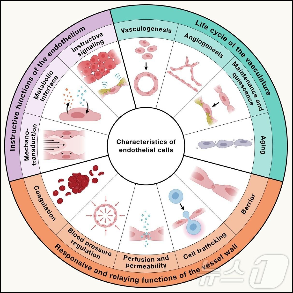 혈관내피세포의 특성.(IBS 제공)/뉴스1독일 하이델베르크 대학 헬무트 아우구스틴 교수(왼쪽)와 IBS 혈관 연구단 고규영 단장 (IBS 제공)/뉴스1관련 키워드기초과학연구원IBS혈관관련 기사"성인 뇌 질환 취약성, 아기 때 면역조절 유전자가 결정"IBS, 뇌 혈류 조절 메커니즘 새로운 시각 제시 성과구본경 IBS 유전체교정연구단장…유럽분자생물학기구 합류IBS 뇌 속 노폐물, 간편 배출 방법 찾았다…"치매 연구 이정표될 것"암세포-혈관 실시간 분석…UNIST, 상호작용 모사 칩 개발