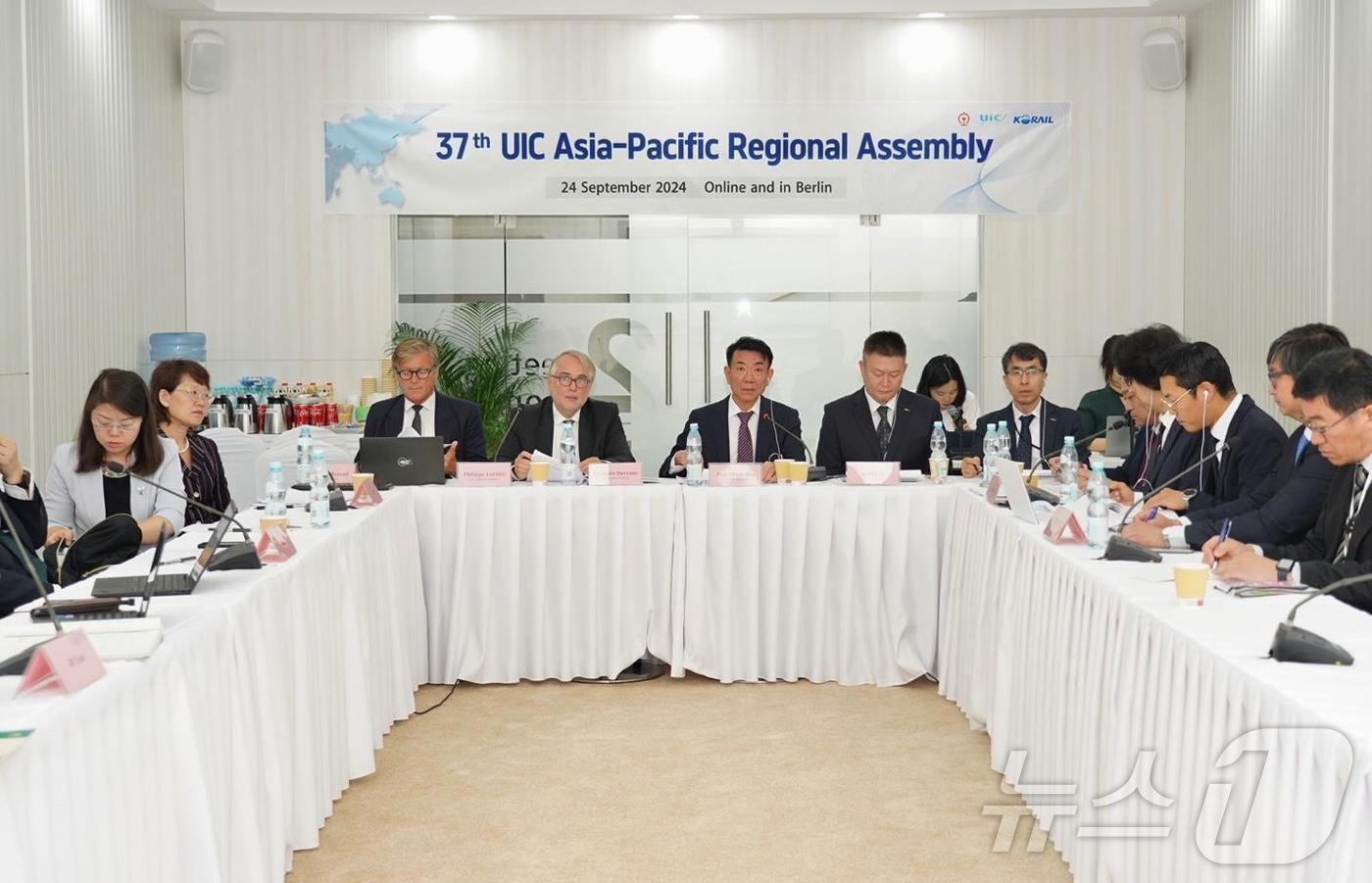한문희 코레일 사장(사진 정면 왼쪽에서 세 번째)이 24일 독일 베를린에서 ‘제37차 국제철도연맹(UIC) 아태지역총회’를 주재하고 있다.(코레일 제공)/뉴스1