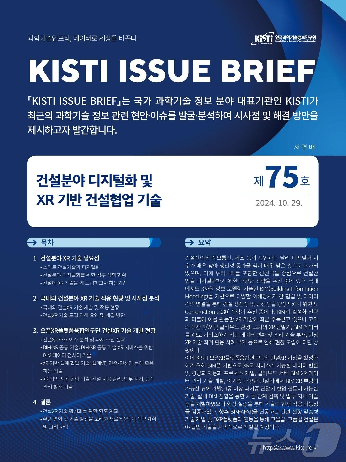 이슈브리프 75호 발간이슈브리프 제75호 웹이미지. (과기정보연 제공)/뉴스1관련 키워드한국과학기술정보연구원KISTI확장현실XR관련 기사KISTI, 유럽 광통신학회서 2년 연속 아시아 유일 데모 선정메타버스 생태계 구축 위한 '개방형 XR 협업' 플랫폼 개발 박차