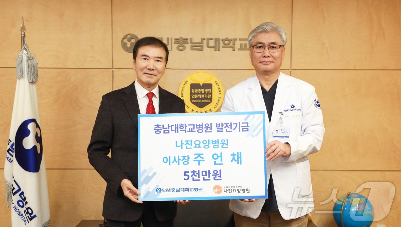 주언채 정다운의료재단 이사장(왼쪽)이 조강희 충남대병원장에게 발전기금 5000만 원을 전달하고 기념사진을 찍고 있다. (충남대병원 제공)/뉴스1