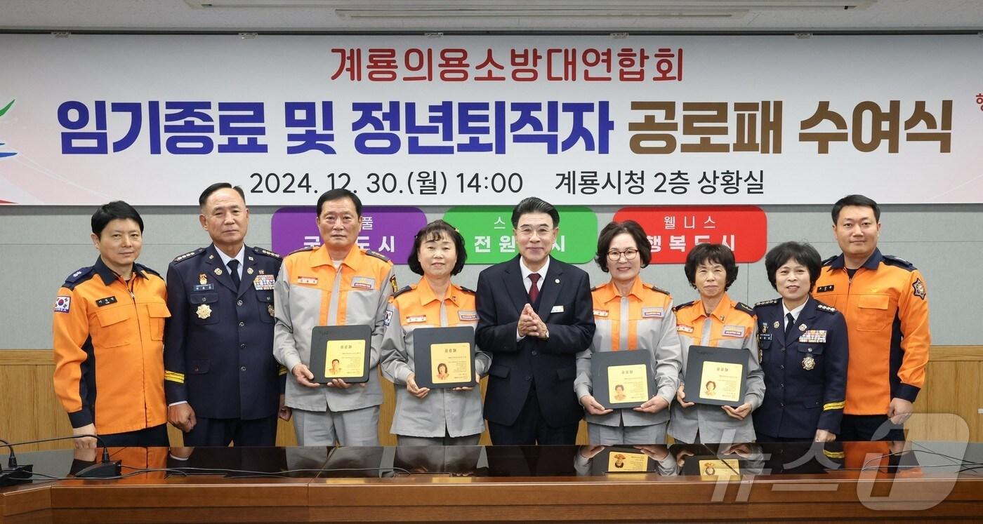 계룡의용소방대연합회 임기종료 및 정년퇴직자 공로패 수여식에서 참석자들이 기념촬영을 하고 있다. 가운데가 이응우 시장. (계룡시 제공) /뉴스1