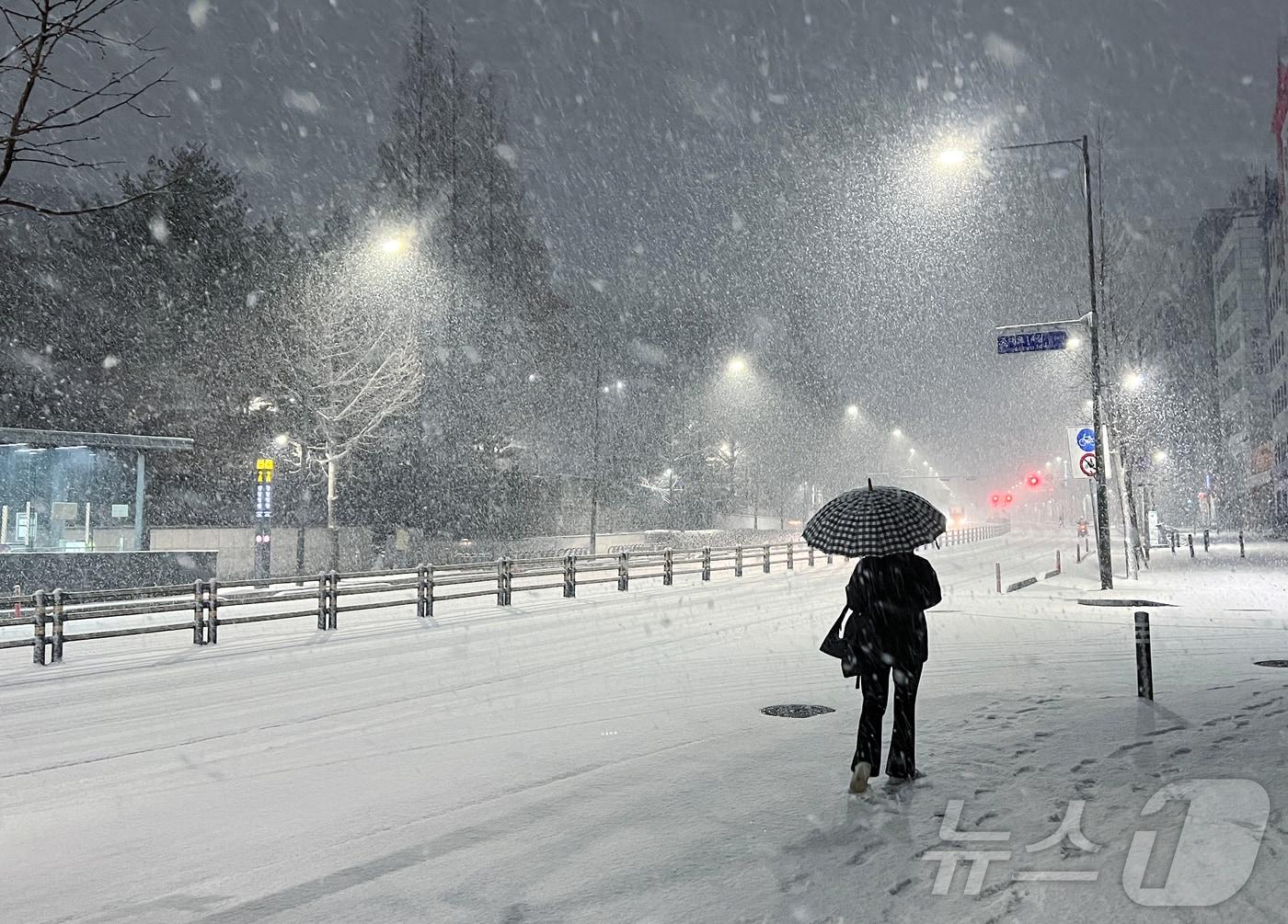 설 명절 연휴 사흘째이자 대설특보가 발효된 27일 밤 서울 송파구 거리에서 시민이 쏟아지는 눈발을 헤치며 발걸음을 재촉하고 있다. 기상청에 따르면 이날부터 28일까지 수도권 10~20㎝(많은 곳 25㎝↑), 강원도 10~20㎝(많은 곳 30㎝ ↑), 충청권 5~15㎝(많은 곳 20㎝ ↑), 전라권 5~20㎝(많은 곳 30㎝ ↑), 경상권 3~10㎝(많은 곳 15㎝ ↑) 등 전국적으로 많은 눈이 올 것으로 전망된다. 2025.1.27/뉴스1 ⓒ News1 박정호 기자