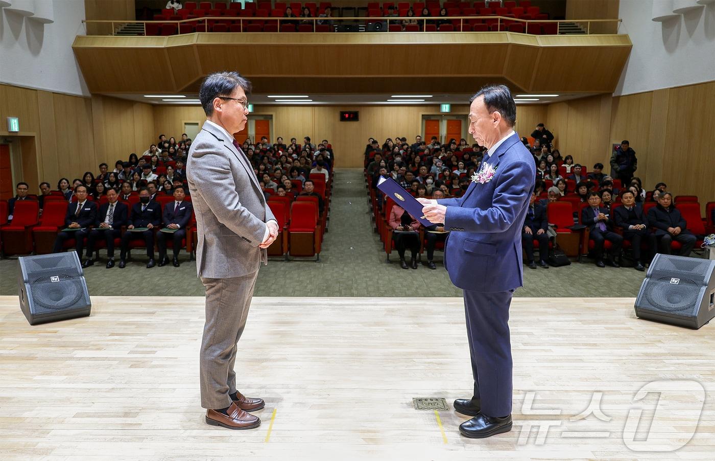 김병수 체육예술건강과 장학관 최우수상설동호 대전교육감(오른쪽)이 적극행정 우수 공무원으로 선정된 체육예술건강과 김병수 장학관에게 최우수상을 수여하고 있다.(대전교육청 제공)/뉴스1관련 키워드대전시교육청대전교육청 적극행정 우수공무원nif2024