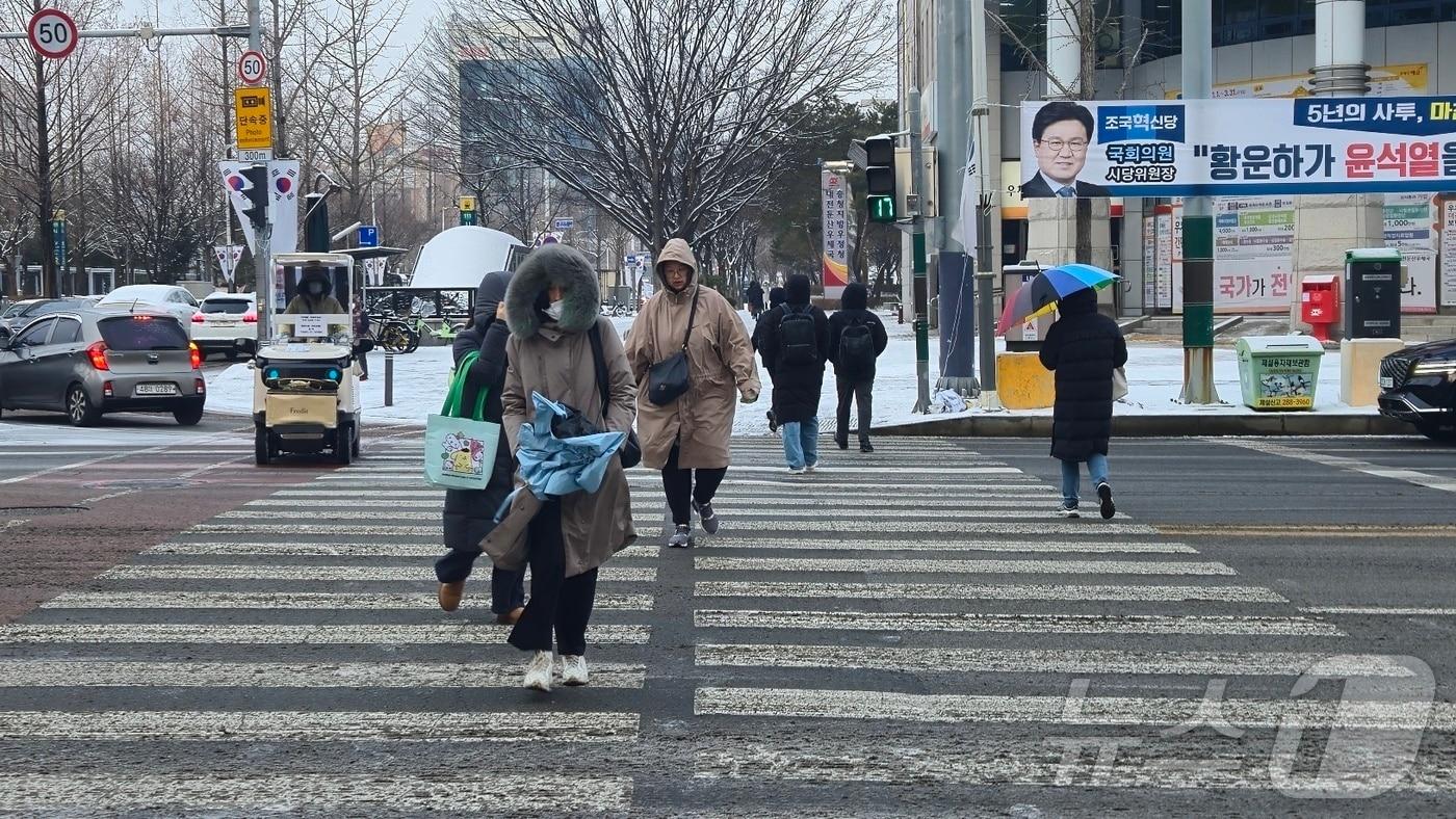 대설주의보가 내려진 7일 오전 대전 시청역에서 시민들이 발걸음을 재촉하고 있다. 2025.2.7/뉴스1 ⓒ News1 허진실 기자
