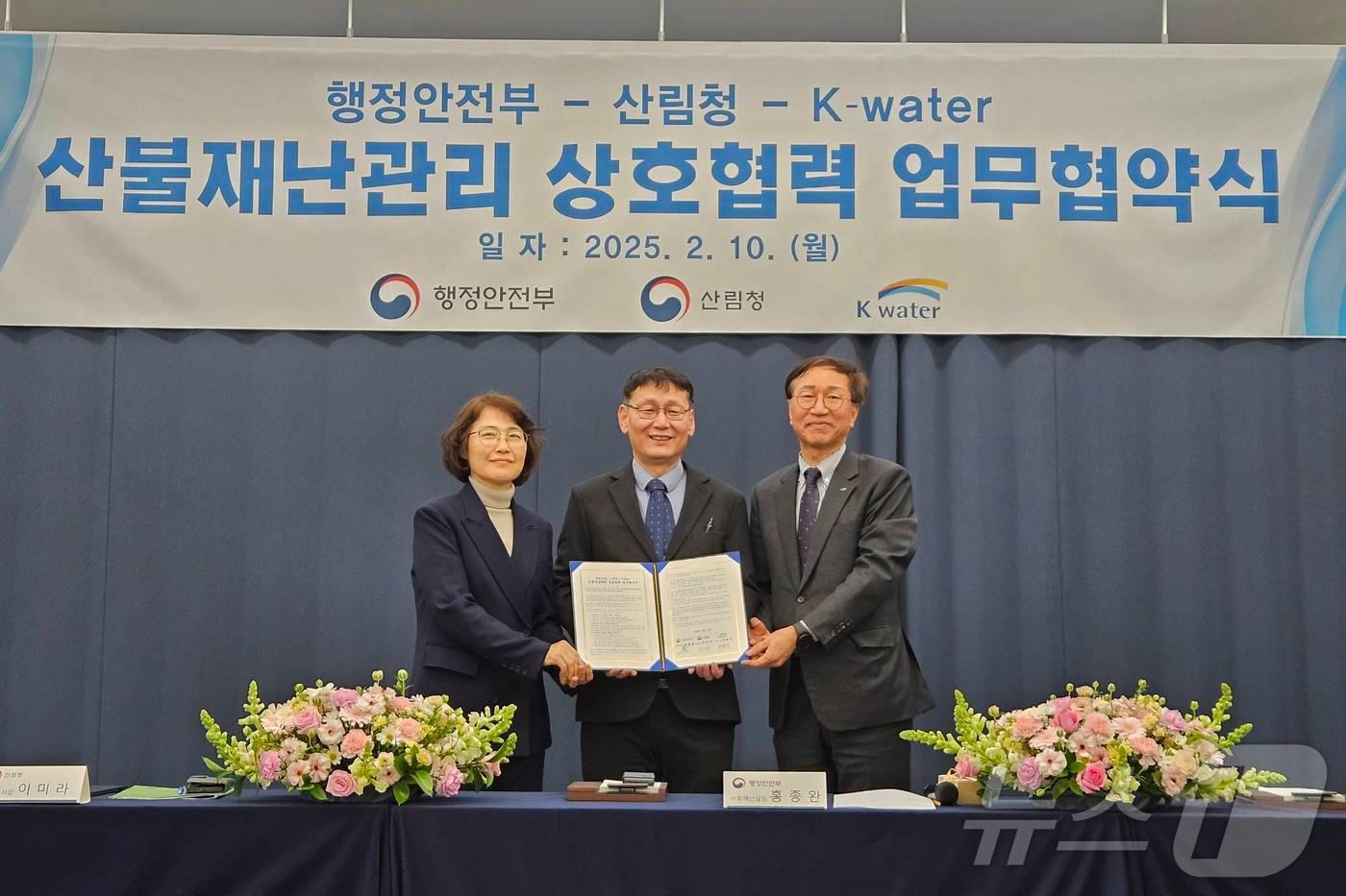 산불 진화용 담수지 및 헬기 계류장 확대이미라 산림청 차장(맨 왼쪽)이 행정안전부 홍종완 사회재난실장(가운데), 한국수자원공사 류형주 부사장과 산불 대응 협력 강화를 위한 업무협약을 체결하고 있다.(산림청 제공)/뉴스1박찬수 기자 개청 77주년 조달청…기념식 개최·업무 유공자 포상금산군 장애인복지관·반다비체육센터 개관…민선 8기 결실