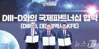 대전시가 13일 기초과학연구원 과학문화센터에서 열린 2025 핵융합산업 상생한마당 행사에서 한국핵융합에너지연구원, 미국 제너널아토믹스사(社)와 핵융합 산업 협력 국제 파트너십 협력 의향서를 체결하고 포즈를 취하고 있다. 왼쪽부터 리차드 존 버터리(Richard J. Buttery) 미국 제너럴아토믹스(G.A.) 자기핵융합에너지(MFE) 그룹 부사장, 이장우 대전시장, 오영국 한국핵융합에너지연구원장(대전시 제공.재판매 및 DB금지)/뉴스1 ⓒ News1