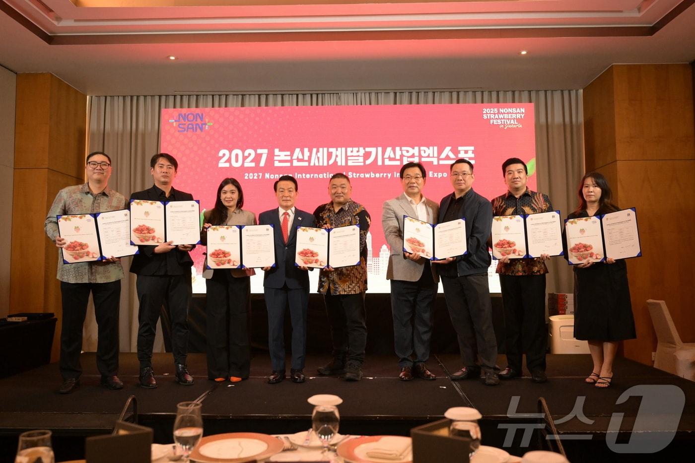 참기름‧딸기우유·바나나우유 등 가공식품도 5년간 수출논산 농식품 기업 관계자들이 인도네시아 현지에서 열린 논산시 농식품 해외 박람회에서 현지 유통업체 6곳과 수출협약을 맺고 기념촬영을 하고 있다.(논산시 제공)./뉴스1