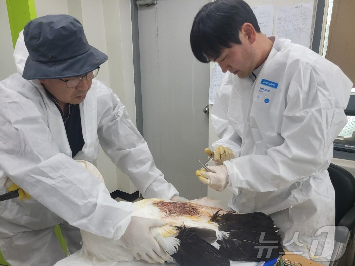 김정호 수의사(오른쪽)가 황새의 질병을 치료하고 있다. (예산군 제공. 재판매 및 DB금지) /뉴스1