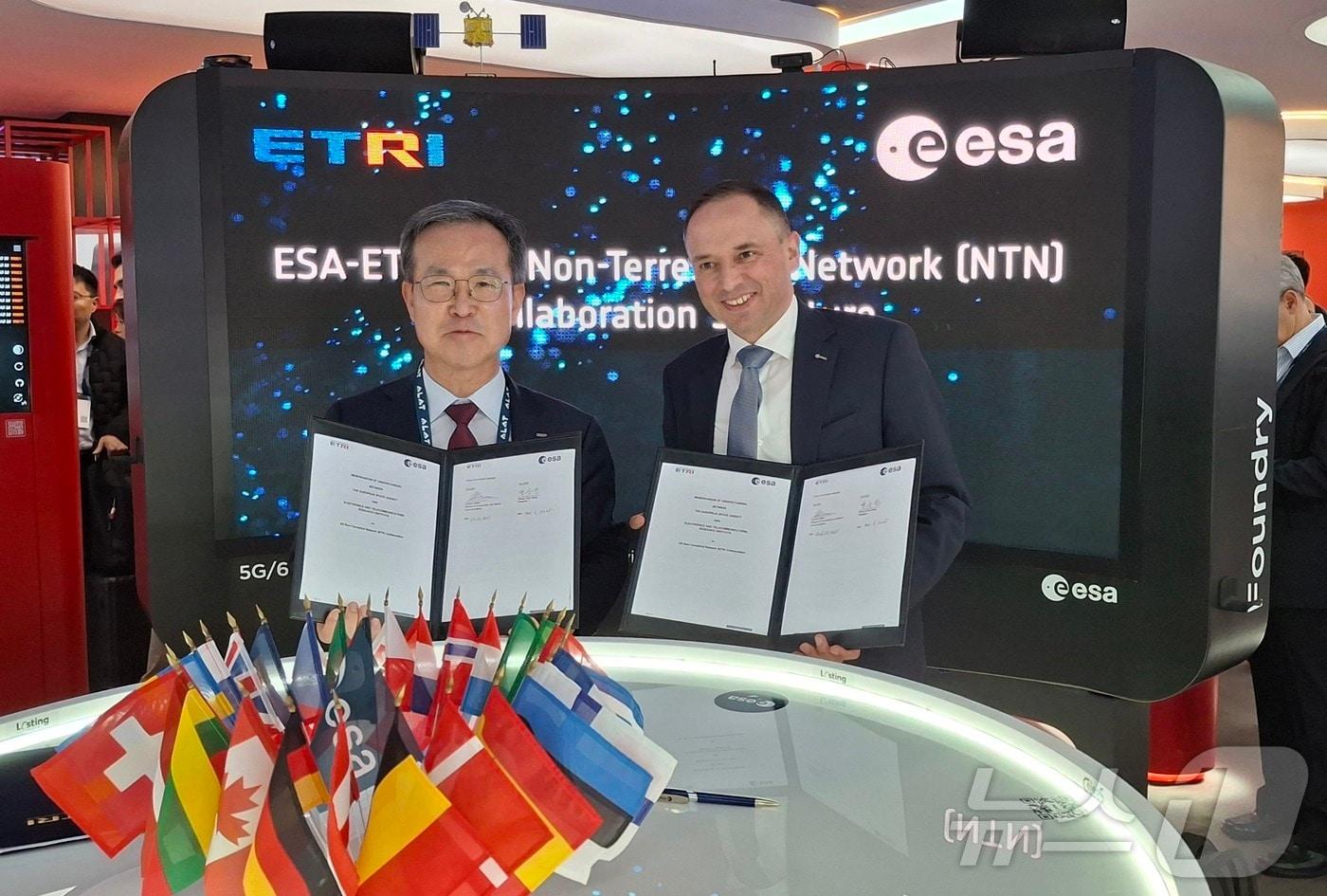 ETRI 방승찬 원장(왼쪽)이 스패인에서 열린 모바일월드콩그레스에서 유럽우주국과 업무협약을 마친뒤 기념촬영을 하고 있다. (전자통신연 제공. 재판매 및 DB금지) /뉴스1
