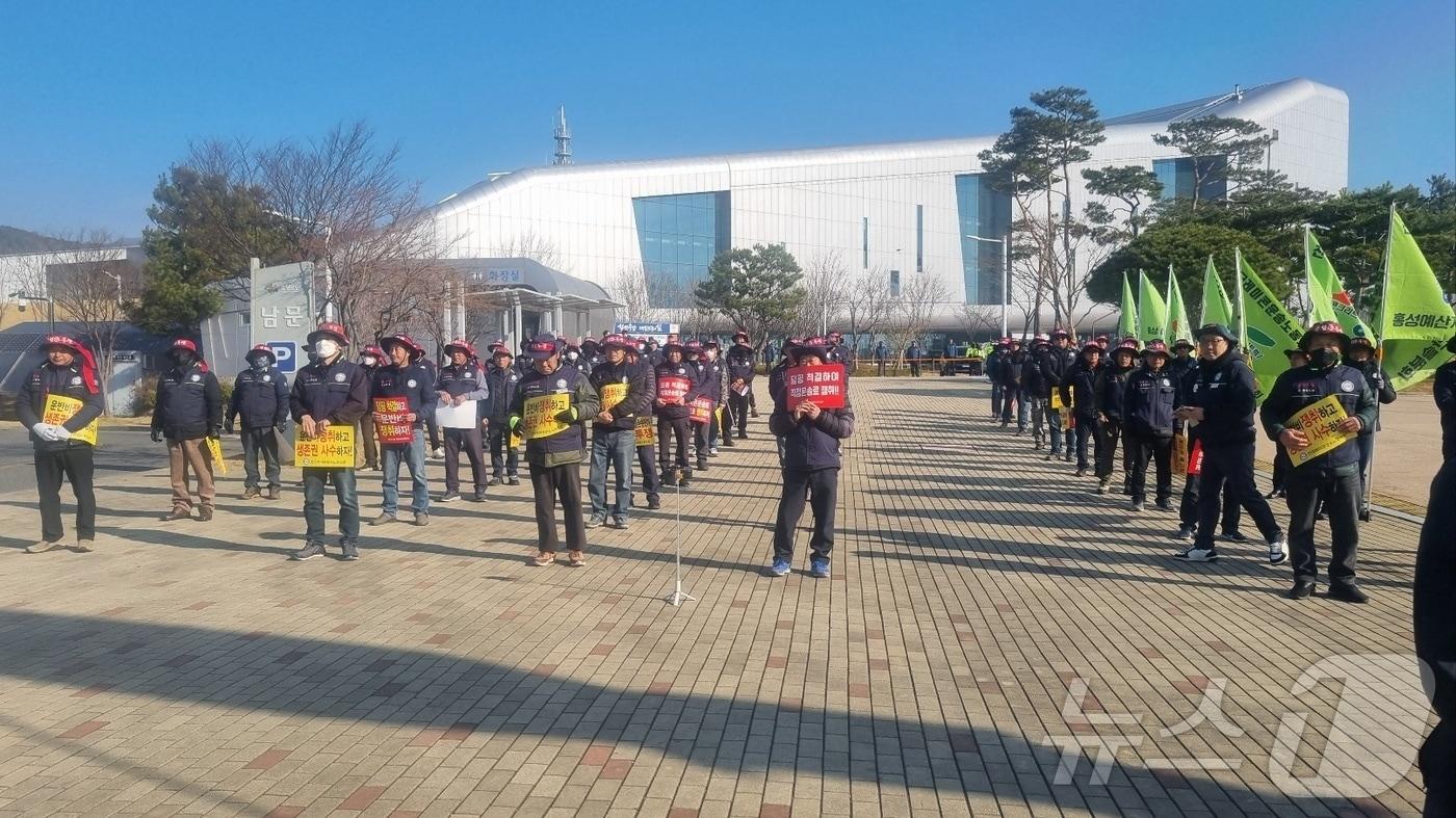 한국노총 전국레미콘운송노동조합 홍성·예산지부가 17일 충남도청 남문 앞에서 레미콘 운송단가 인상 투쟁 발대식을 하고 있다. /뉴스1 ⓒ News1 김태진 기자관련 키워드한국노총 레미콘지부 홍성예산 레미콘