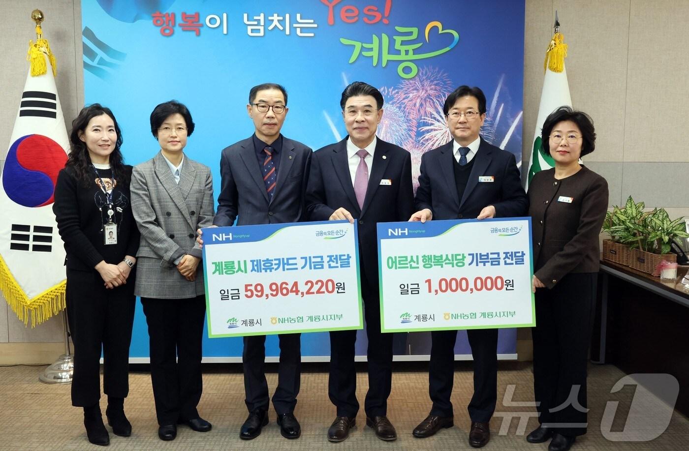 지난해 계룡시가 사용한 법인·보조금카드 사용액 0.5∼1% 적립김광영 NH농협은행 계룡지부장(왼쪽 세번째)이 이응우 계룡시장(오른쪽 세번째)에게 ‘제휴카드 적립 기금’을 전달한 뒤 관계자들과 기념촬영을 하고 있다. (계룡시 제공. 재판매 및 DB금지) /뉴스1