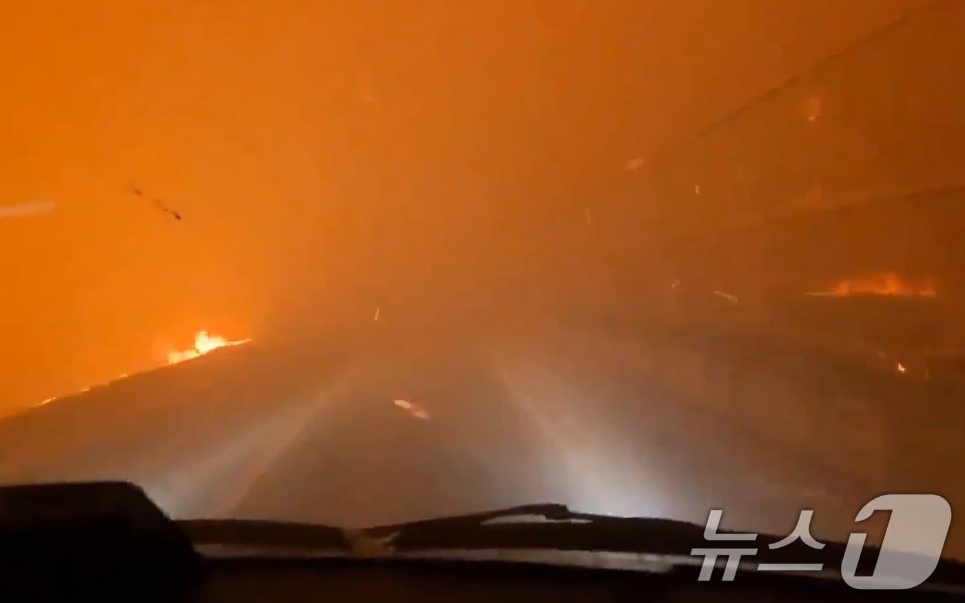 25일 오후 경북 의성군 안평면에서 발생한 산불이 강풍을 타고 안동시 길안면에 이어 풍천면으로 확산되고 있다. 사진은 의성군 단촌면 도로 모습. (독자제공, 재판매 및 DB 금지) 2025.3.25/뉴스1 ⓒ News1 최창호 기자