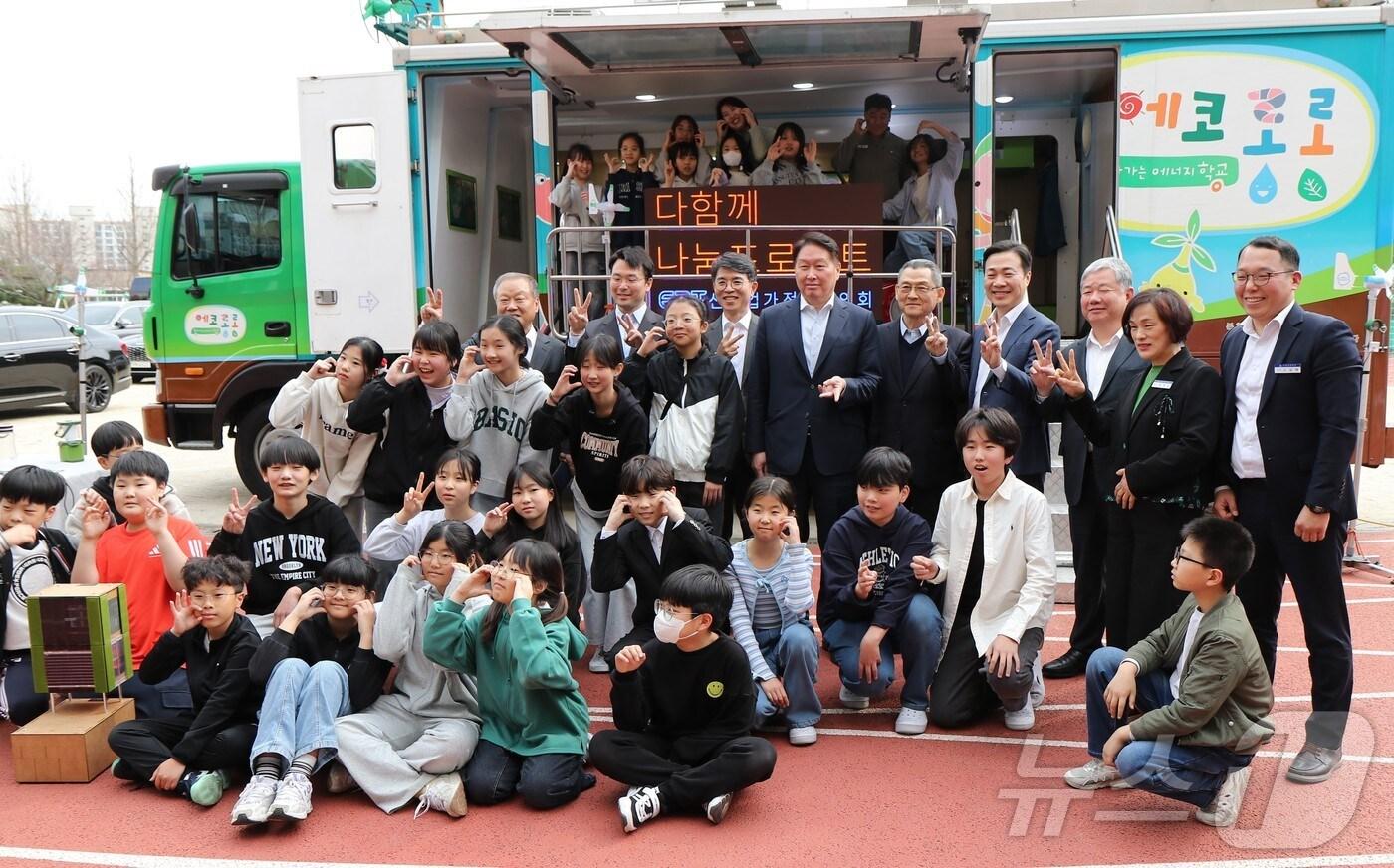 대전 진잠초에서 진행된 ㈜코오롱 ‘에코 롱롱’ 찾아가는 친환경에너지 교육 참가자들이 기념사진을 찍고 있다. (대전상의 제공. 재판매 및 DB금지) /뉴스1