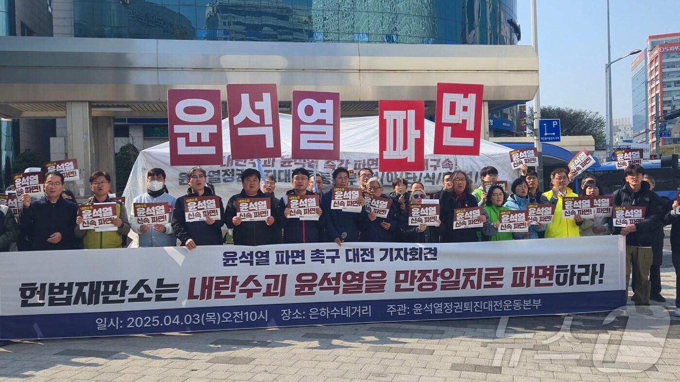 윤석열정권퇴진대전운동본부가 3일 오전 10시 대전 서구 은하수네거리에서 헌번재판소에 대통령 파면을 촉구하고 있다. 2025.4.3 /뉴스1 ⓒ News1 허진실 기자