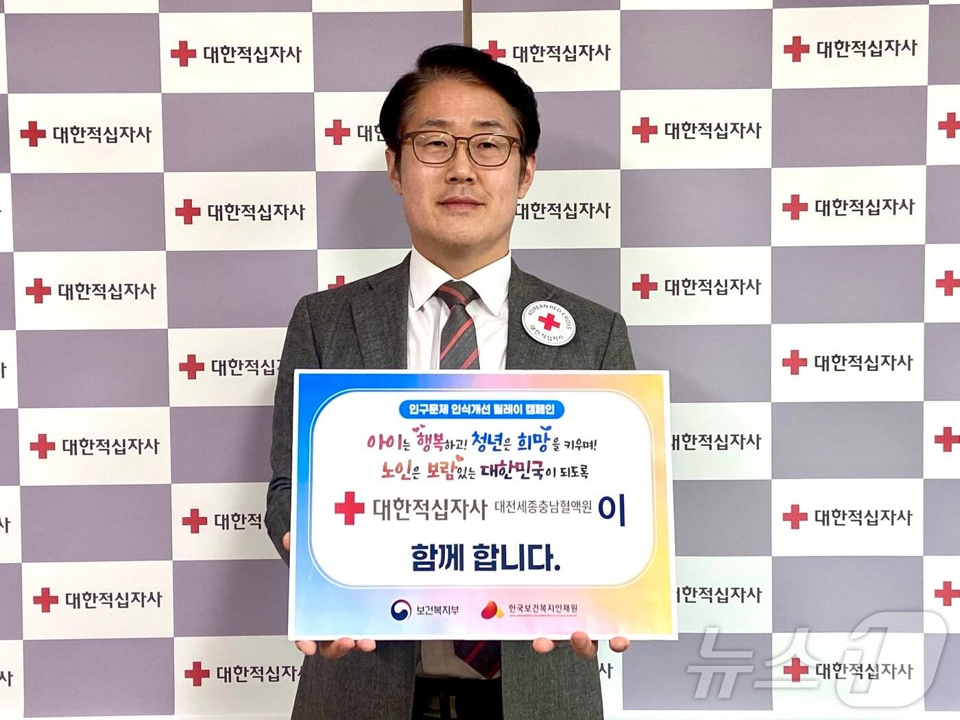 성낙준 대전세종충남혈액원장이 3일 보건복지부와 한국보건복지인재원이 주관하는 '인구문제 인식개선 릴레이 캠페인'에 참여하고 기념사진을 찍고 있다. (대전세종충남혈액원 제공. 재판매 및 DB금지) /뉴스1