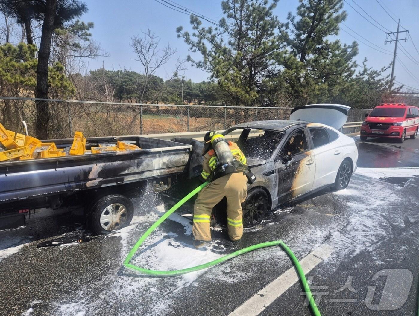 7일 오전 11시 40분께 충남 당진 신평면 국도에서 발생한 차량 3중 추돌 사고 현장에서 소방관이 화재를 진압하고 있다. (당진소방서 제공. 재판매 및 DB금지) /뉴스1