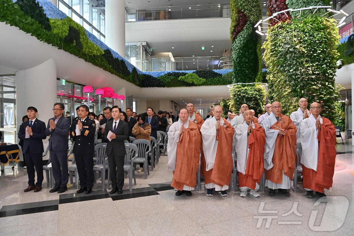 김태흠 충남도지사(앞줄 왼쪽 네 번째)가 충남도청 불자회 관계자와 도신 수덕사 주지 등 스님들과 ‘불기 2569년 부처님 오신날 봉축 연등법회’를 봉행하고 있다.(충남도 제공. 재판매 및 DB금지)/뉴스1