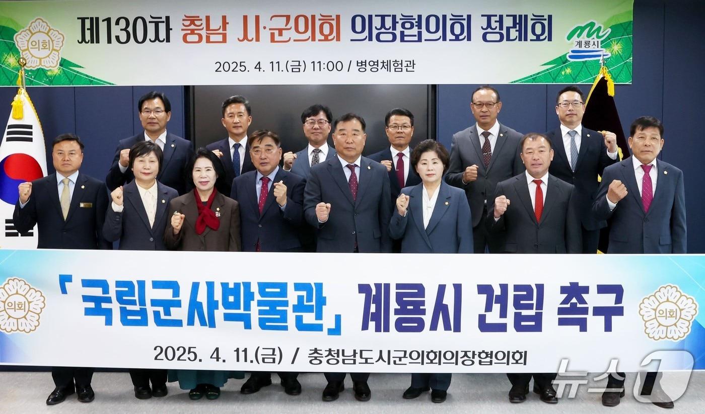 충남 시·군 의장들이 ‘국립군사박물관 건립 촉구 건의문’을 채택한 뒤 기념사진을 찍고 있다. (계룡시의회 제공. 재판매 및 DB금지) /뉴스1