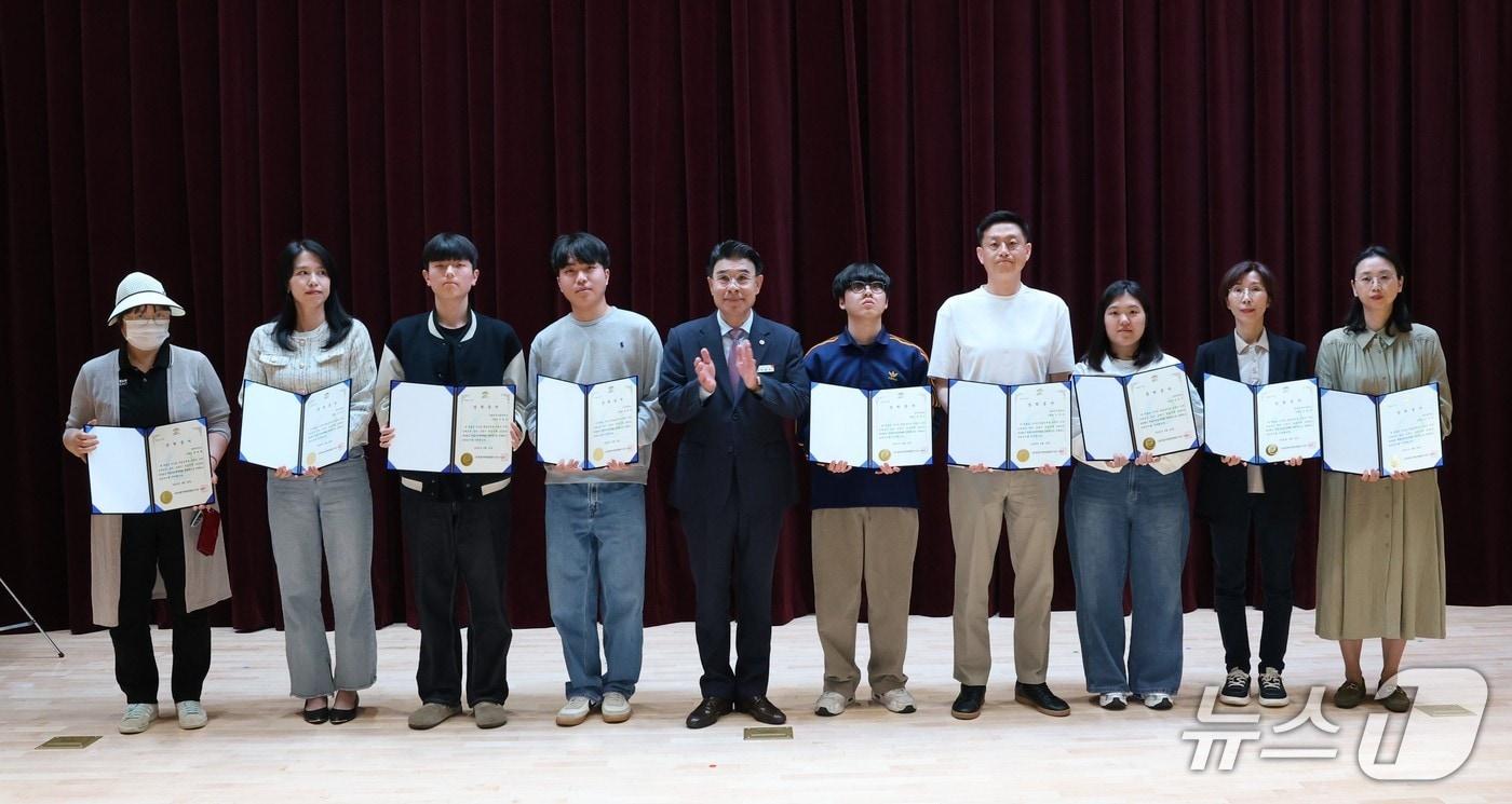 이응우 계룡애향장학회 이사장(왼쪽 다섯번째)이 장학생들에게 장학증서를 수여하고 기념촬영을 하고 있다. (계룡시 제공. 재판매 및 DB금지) /뉴스1