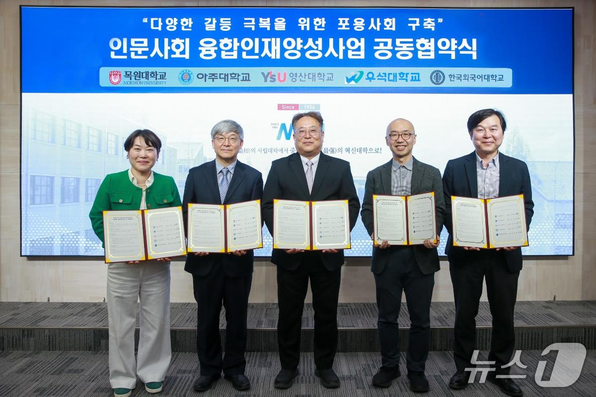 목원대·아주대·영산대·우석대·한국외대 관계자들이 협약서를 들고 기념촬영을 하고 있다.(목원대 제공.재판매 및 DB금지)/뉴스1박찬수 기자 수자원공사, 3년 연속 감사원 콘테스트 사전컨설팅 1위산림복지진흥원, 491명 산모 등에 산림치유프로그램 제공