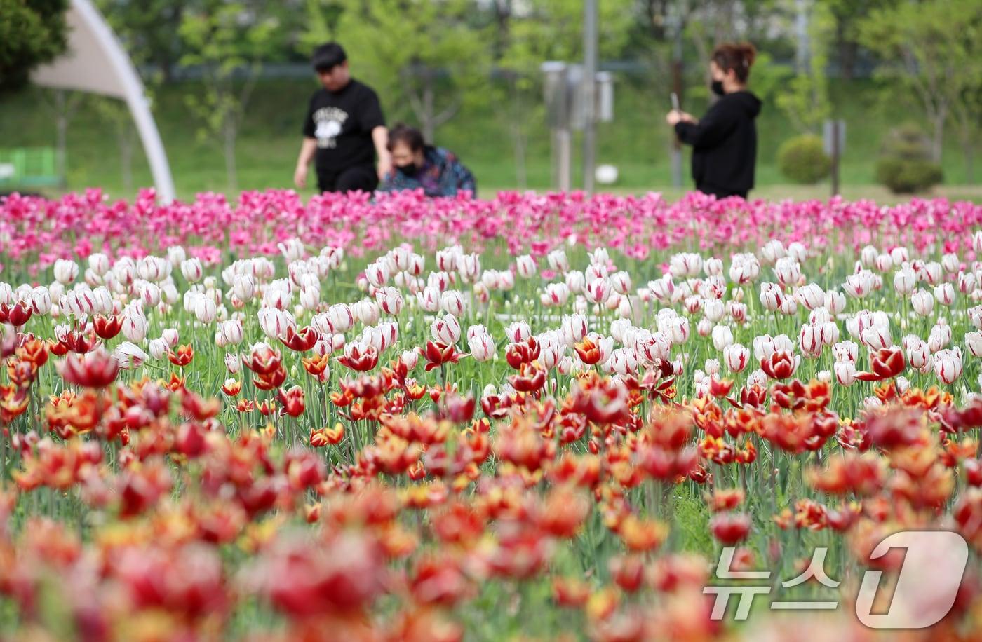 시민들이 튤립꽃 밭에서 사진을 찍고 있다. (자료사진) ⓒ News1 윤일지 기자