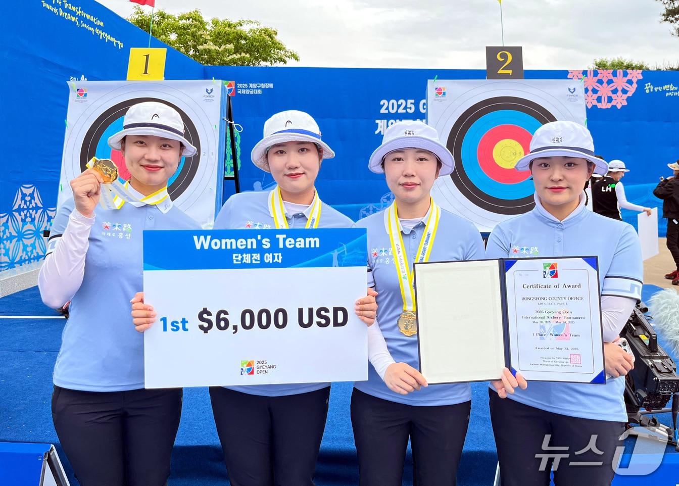 단체전 정상…강팀 순천시청 6:0 완파2025 계양구청배 국제 양궁대회에서 우승을 차지한 홍성군청 양궁팀. (홍성군청 제공.재판매 및 DB금지)2025.5.26/뉴스1관련 키워드홍성군청양궁관련 기사홍성군 홍보대사 김태균 '나비검객' 권효경 금빛사냥 응원