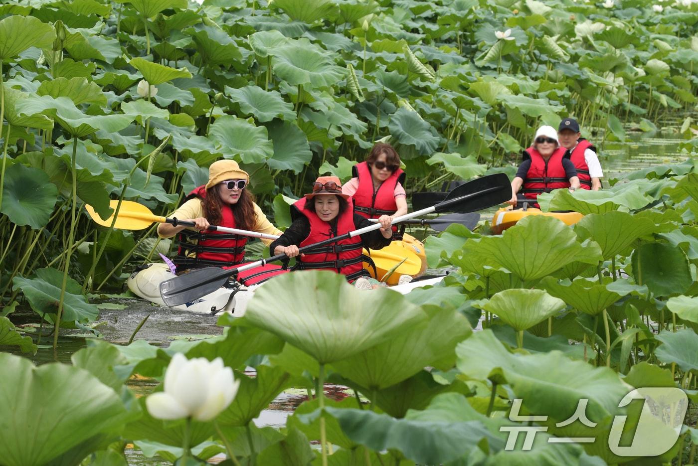 충남 부여 서동공원(궁남지)에서 진행되는 부여서동연꽃축제에서 관광객들이 카누 체험을 즐기고 있다. 2024.7.3/뉴스1 ⓒ News1 김기태 기자