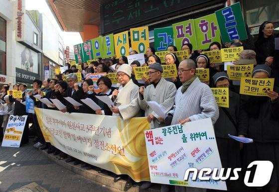 광주 YWCA는 11일 오후 광주 우체국 앞에서 후쿠시마 원전 3주기를 맞아 '탈핵 종교인 선언' 행사를 개최했다. 2014.3.11/뉴스1 © News1 송대웅 기자