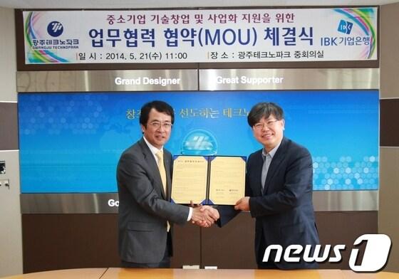 유동국 광주테크노파크 원장(오른쪽)은 21일 오전 본부동 중회의실에서 조희철 IBK기업은행 부행장과 중소기업 및 개인의 우수한 아이디어의 사업화에 필요한 창업자금난 해소를 위한 업무협약을 체결하고 있다./사진제공=광주테크노파크© News1