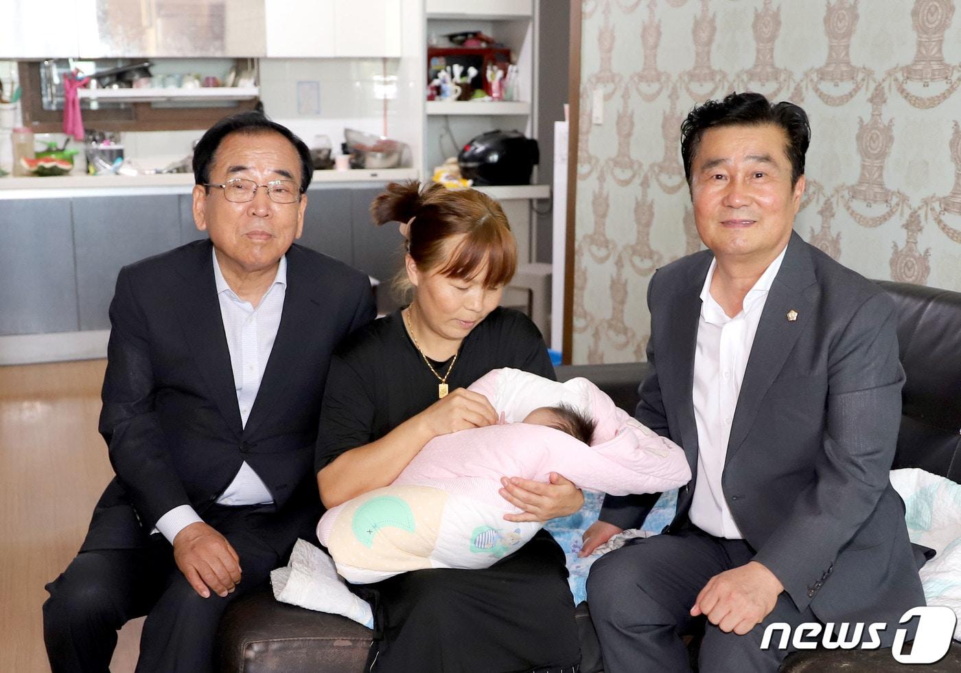 김준성 전남 영광군수(왼쪽)와 강필구 영광군의회 의장(맨 오른쪽)이 지난 8월5일 군서면의 한 가정을 방문, 지난 달 태어난 오승희양을 축하하고 있다.(영광군 제공) 2019.8.6 /뉴스1 ⓒ News1