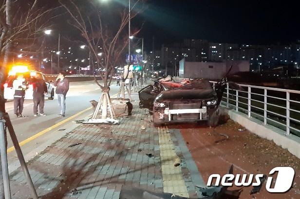 당시 차량 속도 추가 조사…'공소권 없음' 송치 예정경찰과 소방당국이 지난 12일 오전 광주 북구 연제동 연제지하차도 옆 첨단2지구 방면에서 교통안전지주대를 들이받은 차량 추돌 사고를 수습하고 있다.(광주북부소방서 제공) 2020.3.12/뉴스1 ⓒ News1 황희규 기자