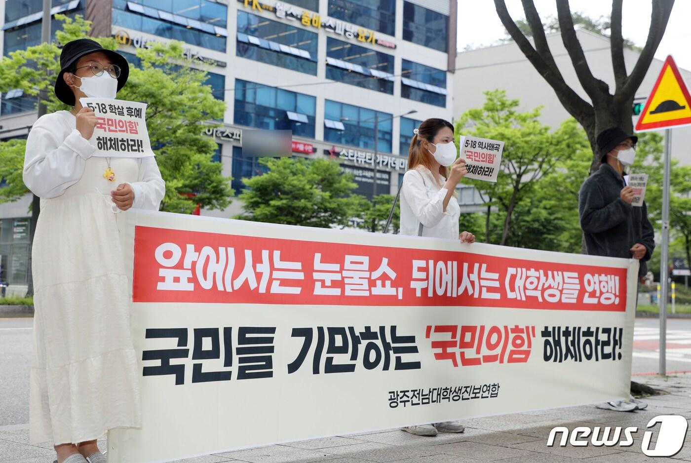 광주전남대학생진보연합 학생들이 21일 오전 광주 서구 치평동 국민의힘 광주시당 당사 앞에서 기자회견을 열고 정당 해체를 요구하고 있다. 2021.5.21/뉴스1 ⓒ News1 이수민 기자