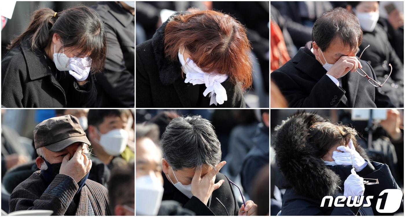 11일 오전 광주 동구 5·18민주광장에서 열린 고(故) 이한열 열사 어머니 배은심 여사 사회장 노제에서 배 여사 장녀 이숙례씨가 유가족을 대표해 인사하고 있다. 2022.1.11/뉴스1 ⓒ News1 황희규 기자