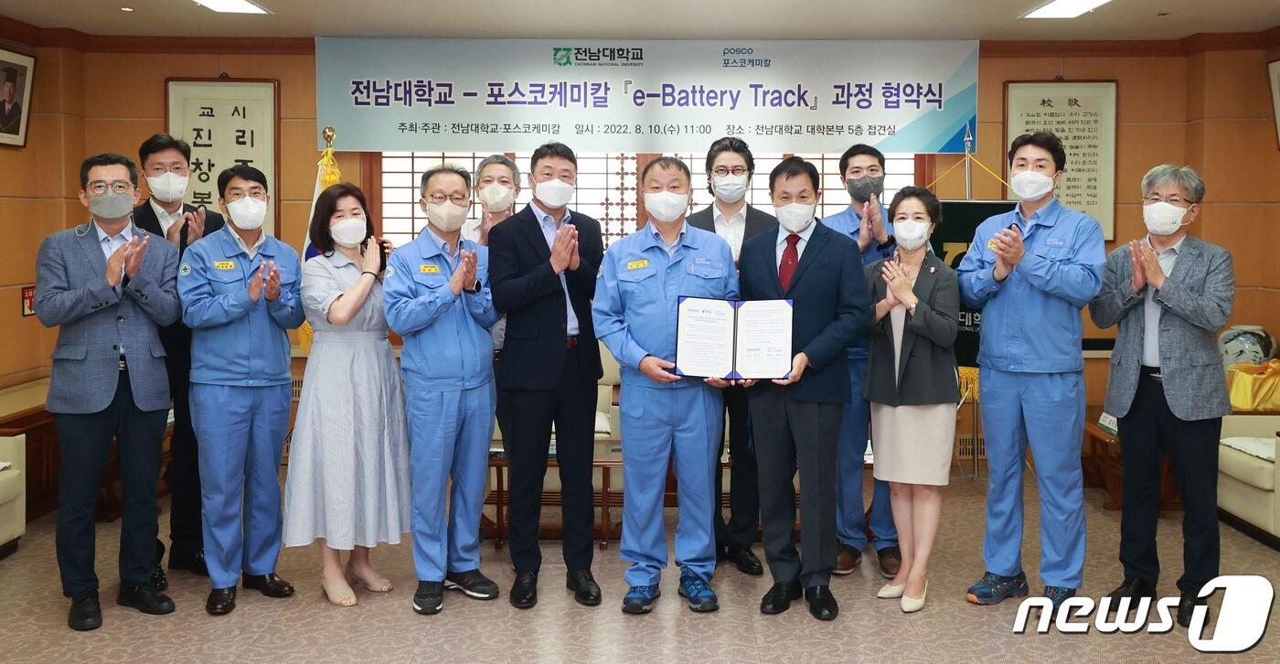 전남대와 포스코케미칼이10일 전남대학교 대학본부에서 이차전지 소재 전문인재 양성을 위한 협약을 체결한 후 기념 촬영을 하고 있다.(전남대 제공)2022.8.10/뉴스1 ⓒ News1