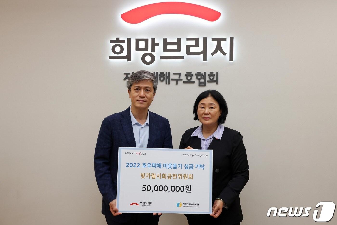 최철호 전국전력노동조합 위원장(왼쪽)과 김정희 희망브리지 사무총장이 29일 오후 서울 마포구 희망브리지에서 수재의연금 전달 기념사진을 찍고 있다.(희망브리지 제공)2022.8.29/뉴스1 ⓒ News1박영래 기자 지난해 12월 광주지역 수출, 전년 동월 대비 27.6% 증가신정훈 "광주·전남 통합에 파격 지원…소중한 물적 토대"