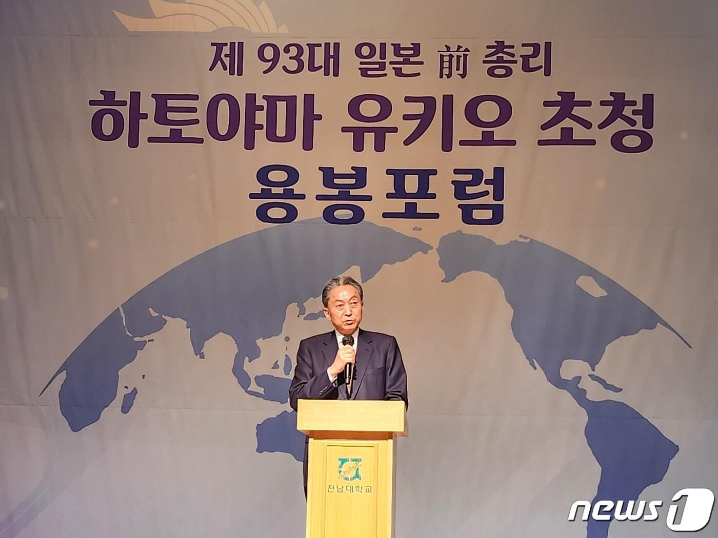 전남대서 강연…"한국이 용서할 때까지 사과하는 마음 가져야"하토야마 유키오 전 일본 총리가 6일 전남대에서 열린 개교 70주년 기념 용봉포럼에서 강연을 하고 있다.(2022.10.6)/뉴스1하토야마 유키오 전 일본 총리가 6일 오후 광주 북구 운정동 국립5·18민주묘지를 찾아 참배하고 있다. 2022.10.6/뉴스1 ⓒ News1 정다움 기자서충섭 기자 윤홍근 BBQ회장, 모교 조선대에 발전기금 10억 기탁광주시의회, 광주전남 행정통합 TF 첫 회의 개최