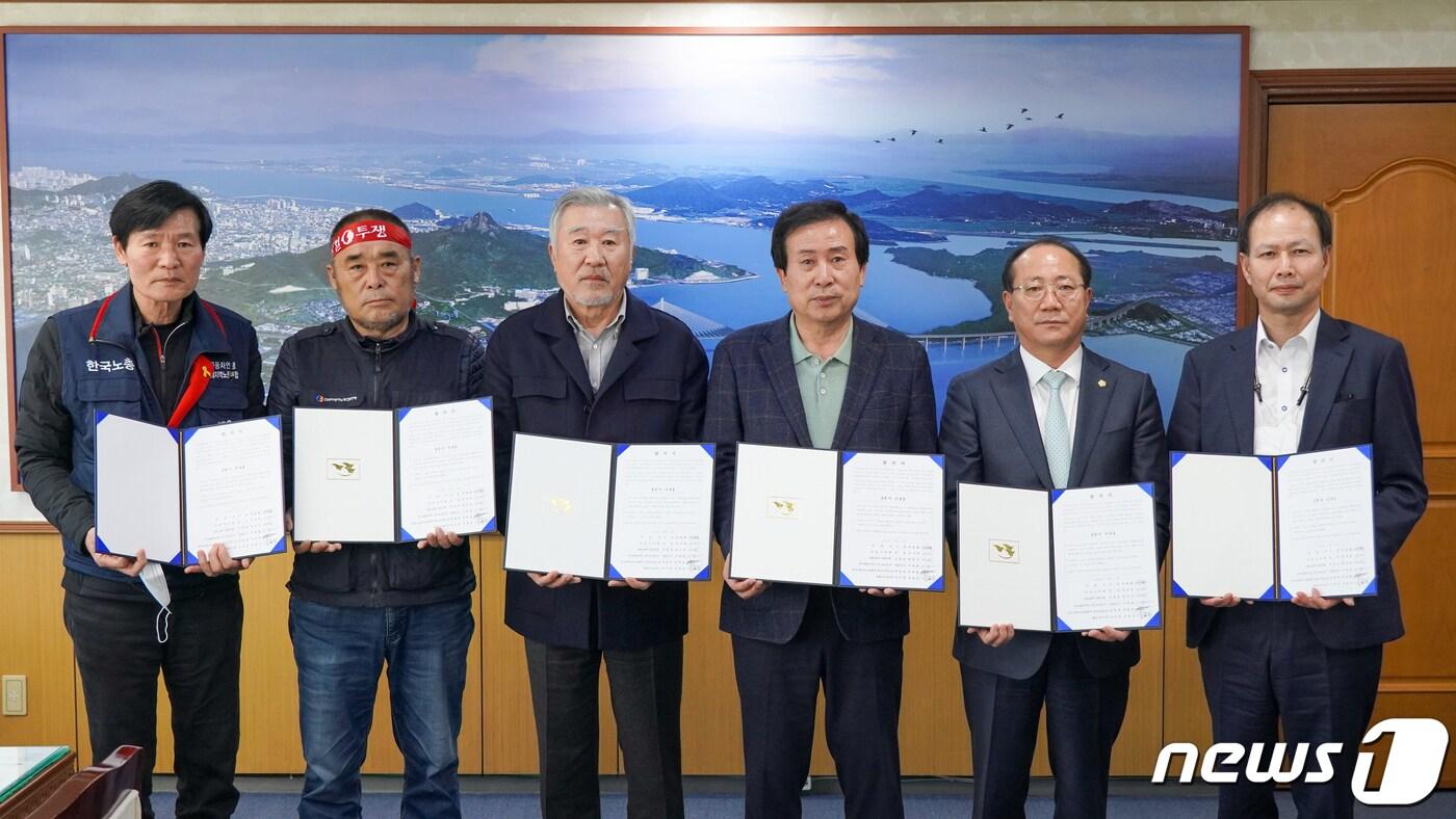 목포시내버스 5자 대표회의가 15일 파업 타결에 합의했다. 왼쪽부터 박춘용 전국자동차노련 광주·전남지역노조위원장, 김용남 태원여객·유진운수 지부장, 이한철 태원여객·유진운수 대표, 박홍률 목포시장, 문차복 시의장, 한인권 고용노동부 목포지청장(목포시 제공).2022.11.15/뉴스1