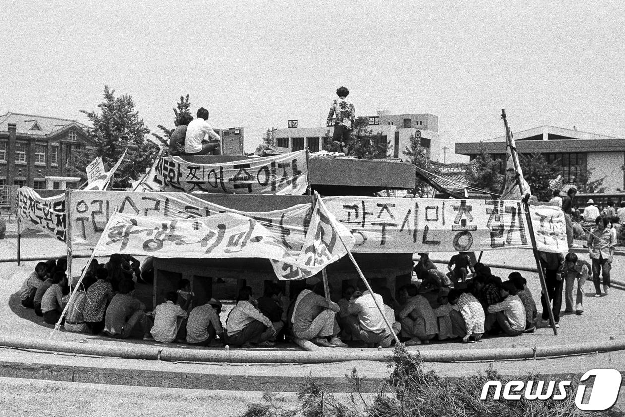 5.18광주민주화운동 당시 전남도청 앞 분수대에서 열린 광주시민 총궐기대회 모습.(한국일보, 광주시 제공)ⓒ News1