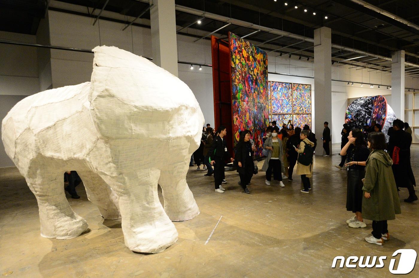 제14회 광주비엔날레 개막을 이틀 앞둔 5일 광주 북구 용봉동 비엔날레전시관에서 열린 프레스오픈에서 언론, 문화 관계자들이 작품을 살펴보고 있다.2023.4.5/뉴스1 ⓒ News1 이승현 기자