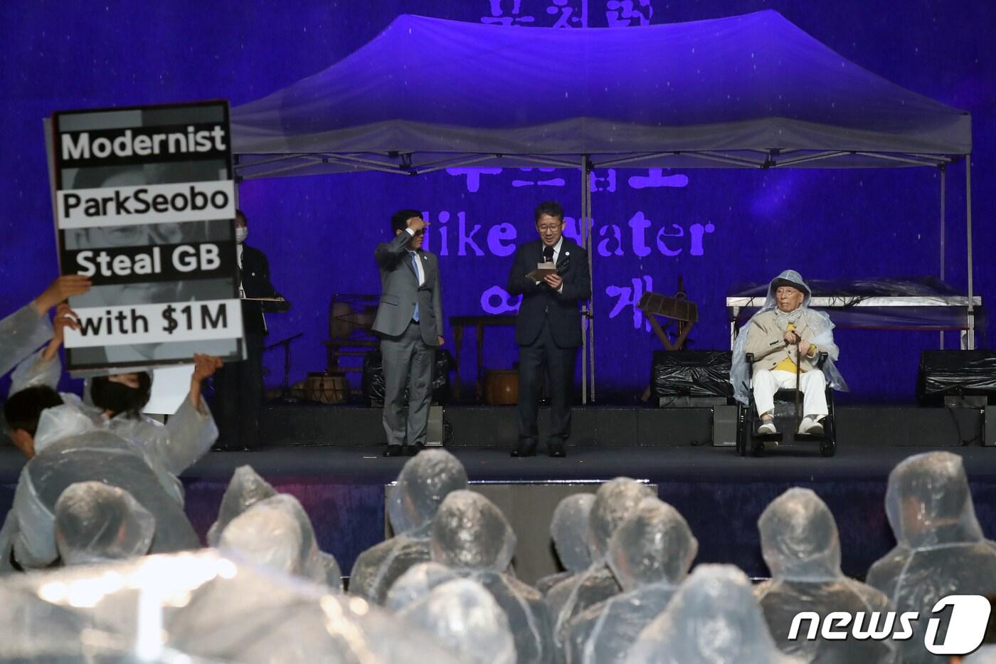 박양우 광주비엔날레 대표이사가 6일 오후 광주 북구 비엔날레 전시관 광장에서 열린 '제14회 광주비엔날레 개막식'에서 '박서보 예술상' 발표하는 가운데 한 에술인이 신설된 예술상을 거부하는 팻말을 들고 있다. 2023.4.6/뉴스1 ⓒ News1 황기선 기자