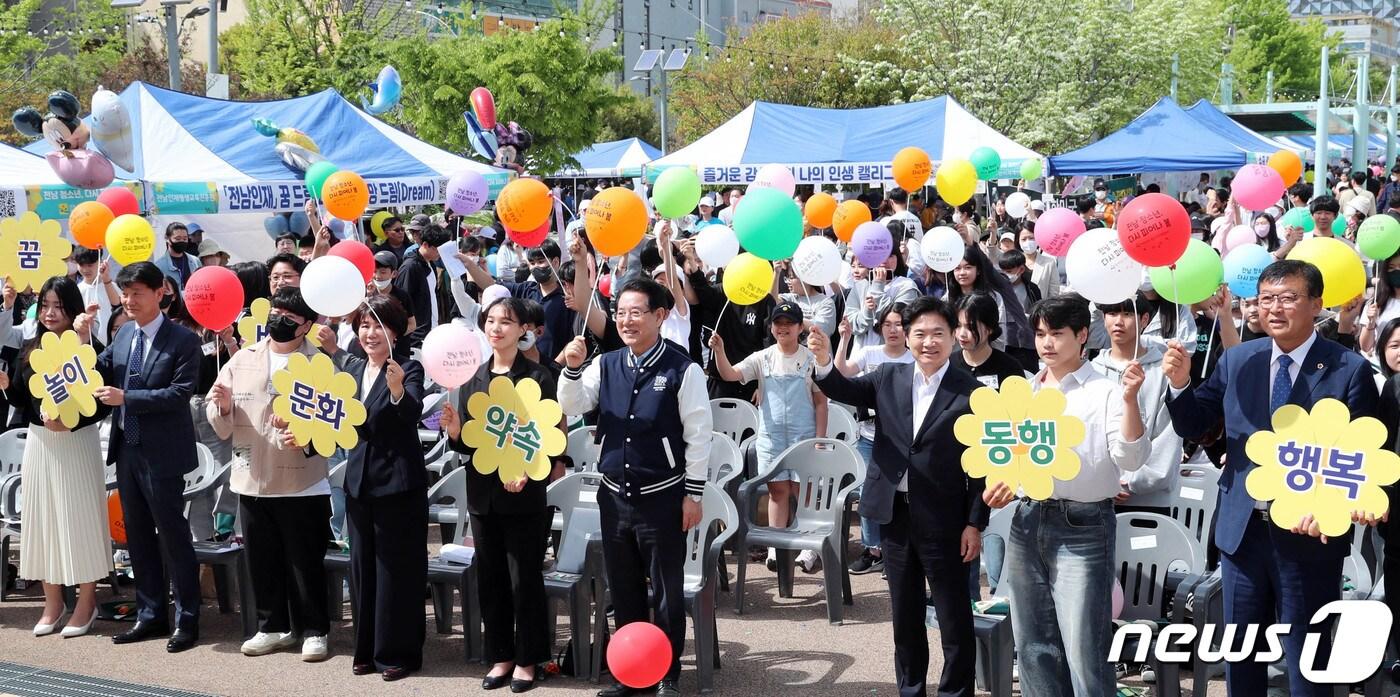 김영록 전라남도지사를 비롯해 김대중 전남교육감, 내빈, 청소년들이 22일 오후 무안군 삼향읍 중앙공원에서 ‘전남 청소년, 다시 피어나 봄!’을 주제로 연린 2023년 전라남도 청소년어울림마당 개막식에서 퍼포먼스를 하고 있다.(전남도 제공) 2023.4.23/뉴스1